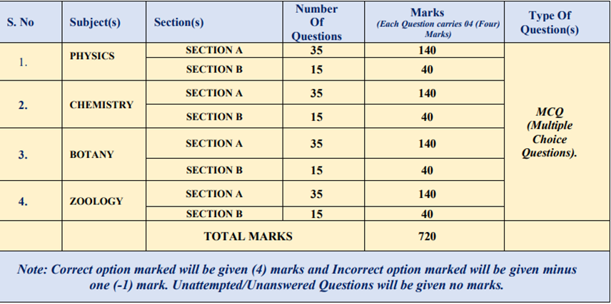 The pattern for the NEET (UG) – 2024 Examination for admission in the Session 2024-25 is as follows: